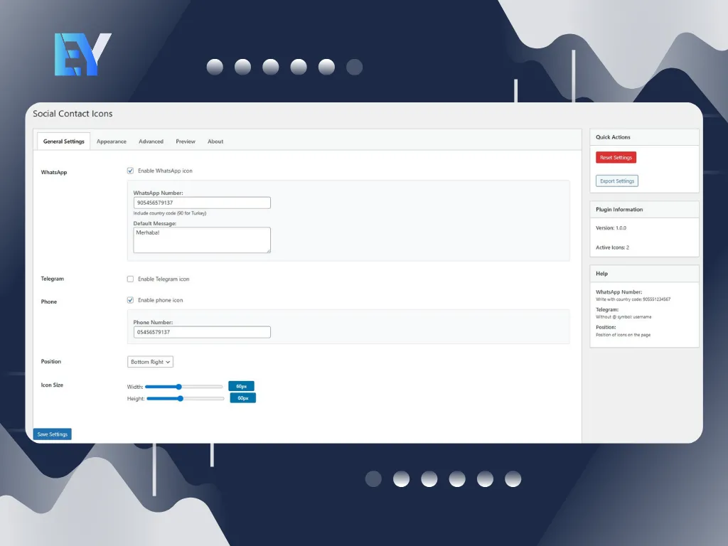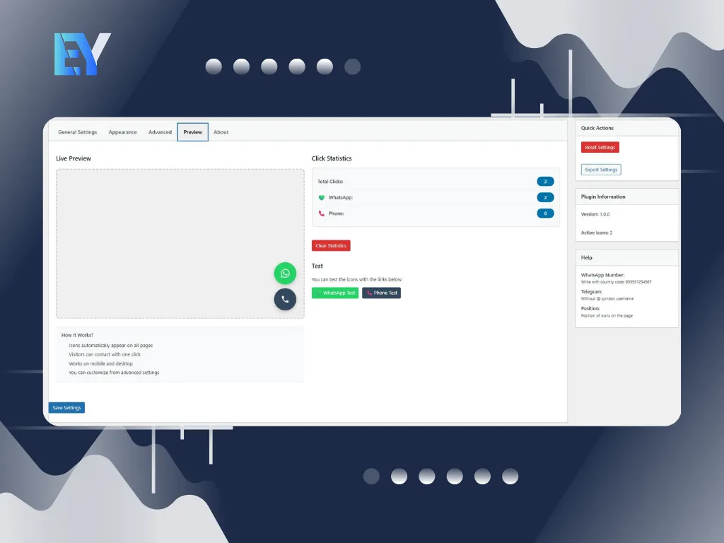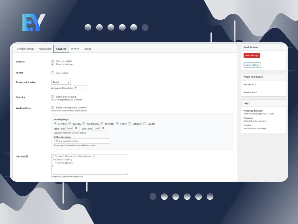 Place floating WhatsApp, Telegram and phone buttons anywhere on the page. Customize every detail: size, colors, position, border radius, animations, hover effects and working hours schedule.